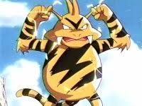 Dex: Electabuzz um pokemon tipo elétrico muito forte que quando vê vermelho fica super extressado e não e nem um pouco amigável.